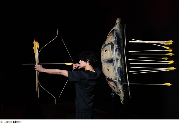 Tantôt équilibriste, danseur païen, tireur à l’arc ou chanteur, Erwan Ha Kyoon Larcher construit une succession d’actes à relier qui sont autant de discours muets et de questions ouvertes sur le temps qui passe, la responsabilité, les choix à faire.