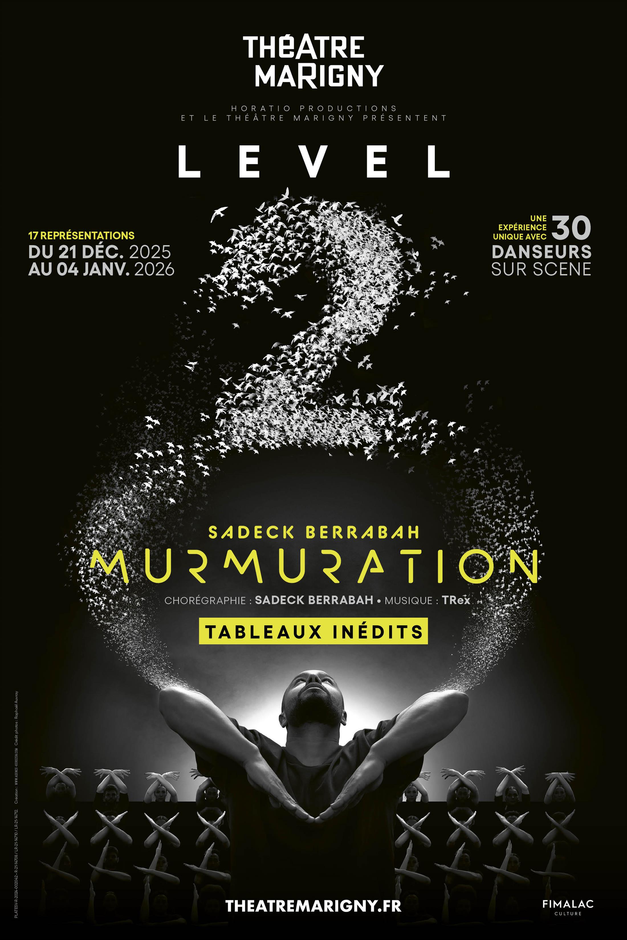 Après une tournée des Zénith qui a fait salles combles et son triomphe avec plus de 300 000 spectateurs depuis sa création au 13e Art en 2023, le chorégraphe Sadeck Berrabah propose Murmuration Level 2, avec 17 représentations sur la grande scène du Théâtre Marigny.