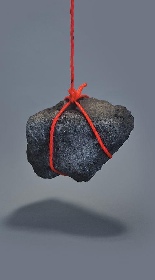 Dans un espace épuré, elles reconstituent différentes situations de conflit à l’aide d’une maquette, de morceaux de craie, de ficelle rouge, tandis qu’au-dessus d’elles, un étrange rocher reste suspendu dans l’air.