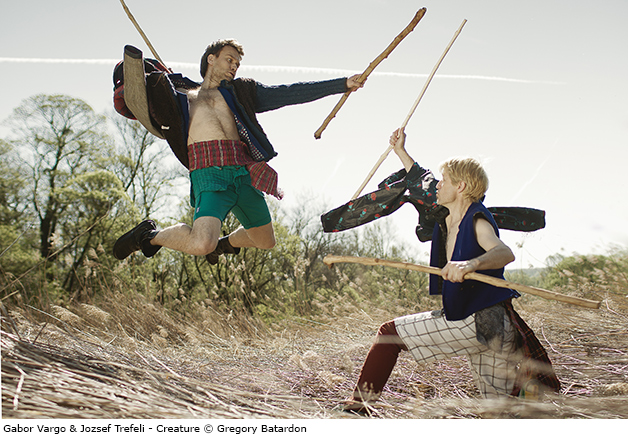 En nommant leur pièce du nom qui désigne un individu crée par Dieu mais sous-entend aussi un être hors norme, les deux chorégraphes-danseurs placent Creature à la fois sous le signe de l’origine et de l’exotisme, du mystère. Ils convoquent donc les ingrédients du folklore - mise en place de rituels, danse exprimant une puissance archaïque, pieds frappant le sol, accessoires, masques et costumes évoquant les rituels païens et donnant aux deux interprètes des allures de totems colorés et dansant - mais ils les déplacent. Le bâton et le fouet très présents dans le vocabulaire de la danse traditionnelle, sont ici manipulés, posés, reposés, et explorés pour leur résonance spatiale et leur consonances rythmiques plus que comme des symboles de force et de virilité. Ce faisant, ils donnent à leurs jeux martiaux et leur marche impérieuse une dimension un peu absurde et farcesque : leur danse est bien héritée des temps passés, mais filtrée par le prisme du contemporain. Inspirée de l’art du recyclage, puisant à différentes sources, revisitant l’histoire de leur propre folklore mais le mêlant celui d’autres pays pour en extraire l’essence et le dénominateur commun, ils évoluent au centre du public, comme dans les compétitions de hip-hop, et finissent par prendre à témoin les spectateurs de leur étrange cérémonial. József Trefeli et Gábor Varga se livrent ainsi à un éloge joyeux, plein de puissance et d’énergie, de toutes les appropriations et de toutes les métamorphoses.