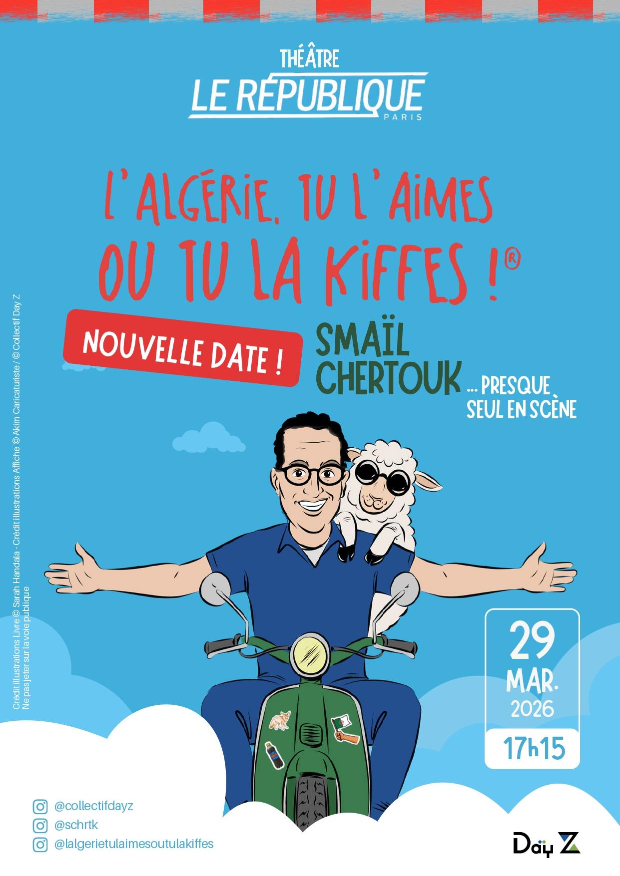 Écrit et interprété par Smaïl Chertouk, L’Algérie, tu l’aimes ou tu la kiffes ! invite à faire l’expérience algérienne, faite de dérision, de découverte et de tendresse. Cette ode à l’Algérie joue avec les idées reçues et notre méconnaissance, parfois entretenue, d’une culture jumelle par l’espace et le temps.