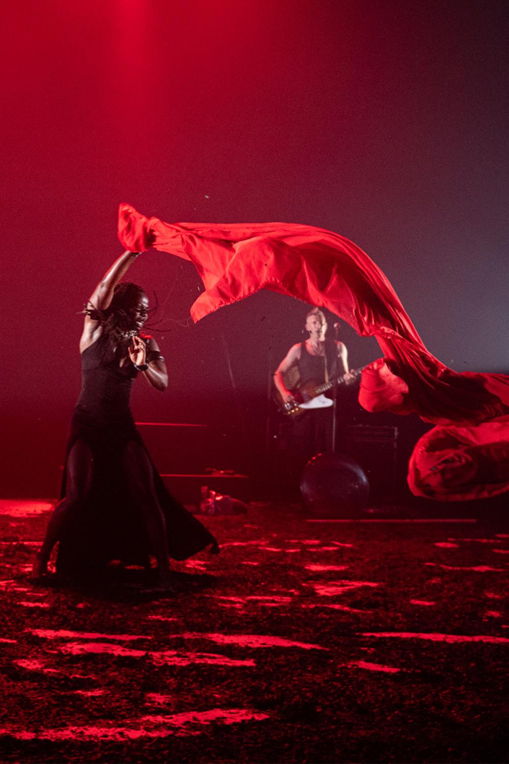 Florence Gnarigo incarne cette femme martyre, arrêtée, jugée pour hérésie, condamnée au bûcher et brûlée vive. Sur le texte de l’auteur et metteur en scène Dieudonné Niangouna, accompagnée par la musique de Benoît Lugué, Marvin Jean et de la chanteuse Dina Mialinelina, la danseuse évolue sur un champ de bataille bientôt jonché de braises incandescentes. Ensemble, ils tissent une ode aux femmes qui luttent contre l’oppression et nous ramènent à des questionnements universels.