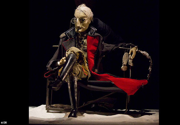 Cinq interprètes manipulent les marionnettes au bout de baguettes rigides, et c’est toute l’horreur de la guerre qui empoigne le spectateur. A quoi peut ressembler un spectacle de marionnettes où il n’est question que de guerre et de dévastation ? Rezo Gabriadze a imaginé une scène d’un mètre cinquante sur soixante centimètres recouverte de sable aux allures de neige, où sont enfouis des souvenirs de la guerre, et sur laquelle surgissent des créatures de porcelaine, de papier mâché ou de chiffon, manipulées à vue par des comédiens.