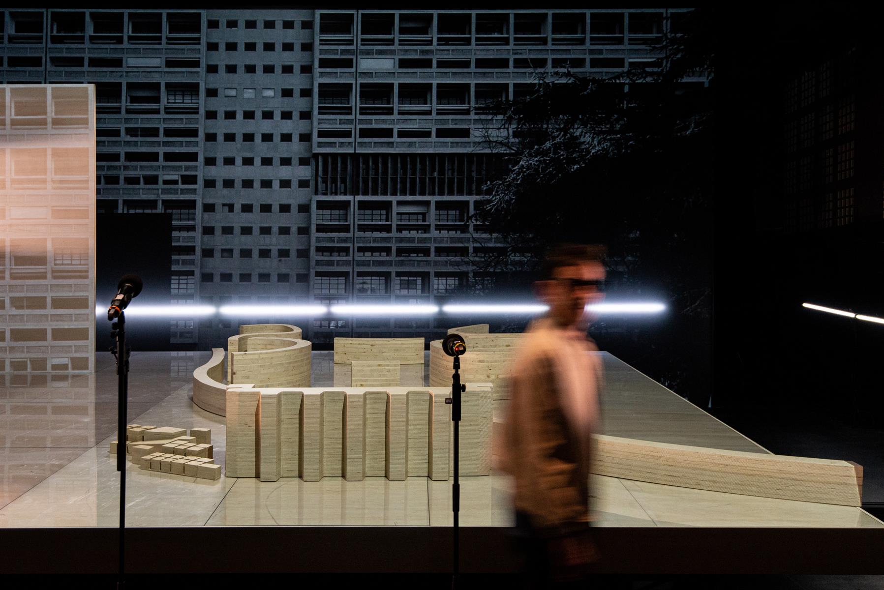 Le spectacle commence par un long tunnel purement narratif, pas du tout théâtral, fort ennuyeux. Suivent les pièces d’un spectacle kaléidoscopique. Au fil des fragments, la scène s’anime parfois mais il faut s’accrocher; on comprend qu’il est entre autres question de la décennie noire en Algérie mais sans vraiment saisir l’intention de l’autrice. Le décor imposant donne une large place à une maquette du projet imaginé dans les années trente par Le Corbusier pour Alger. Pourquoi ? On ne sait pas. Apparaît aussi l’image vidéo de la scène vue du plafond. Cela n’apporte rien mais, au moins, c’est distrayant. Tout-à-coup, sans que, pris par votre torpeur, vous ne l’ayez vu venir, vous voyez les comédiens quitter la scène et entendez un spectateur applaudir. Bonne surprise, c’est l’entracte. Vous pouvez rentrer chez vous.