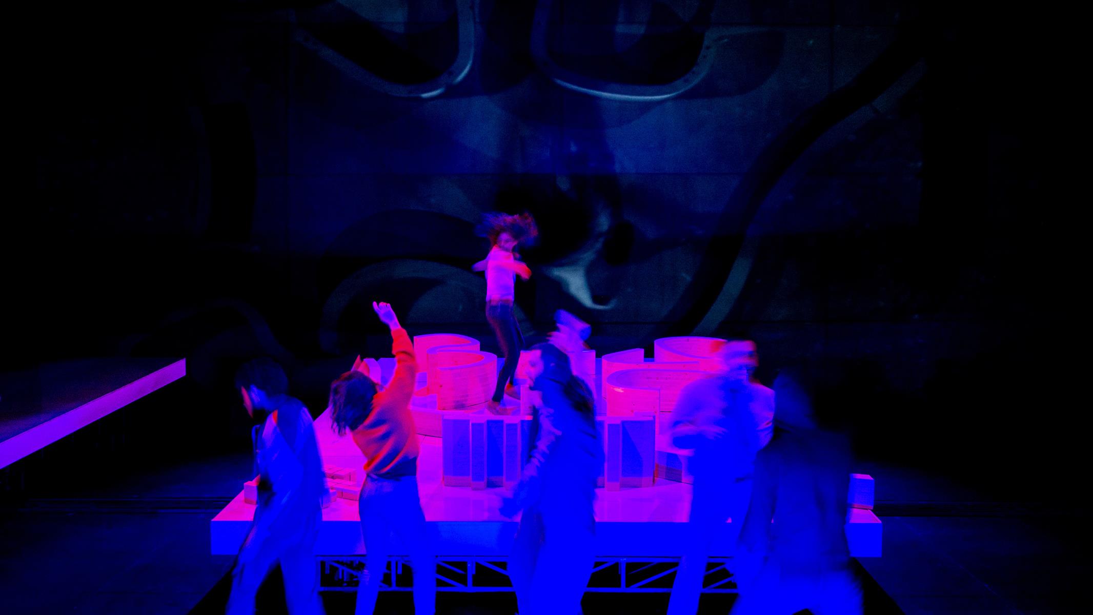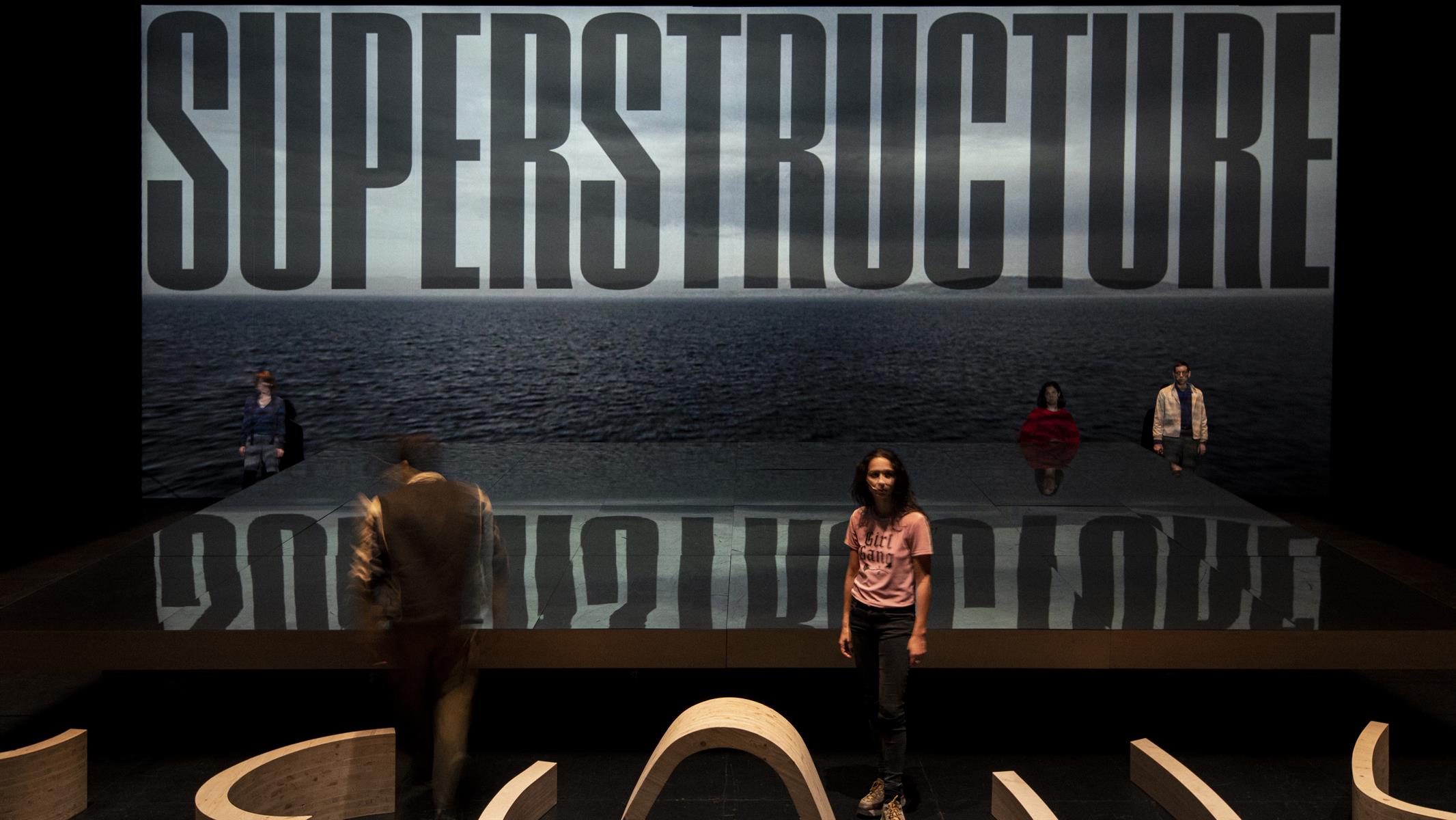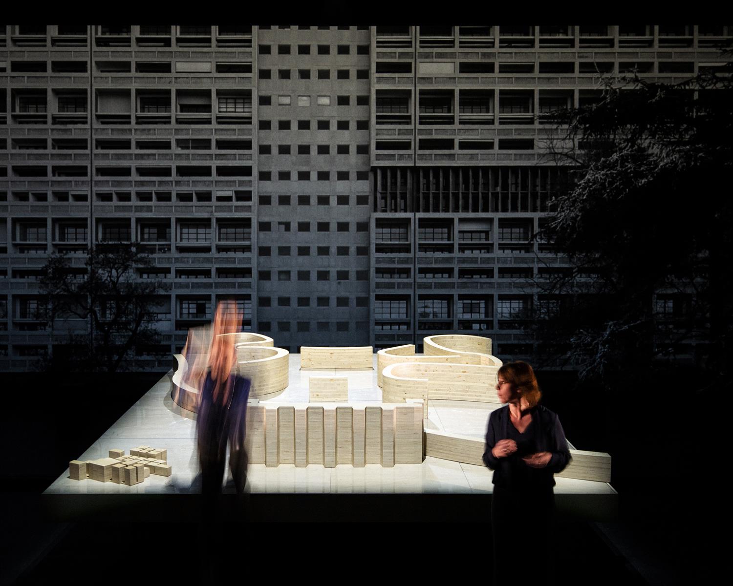 Cette parole éclatée surgit dans un décor dystopique, un Alger fictionnel tel qu’il fut fantasmé par Le Corbusier dans les années 30. Avec le plan « Obus », l’architecte avait imaginé une Cité Radieuse algéroise, avec un immeuble long de 10km dont la toiture serait une autoroute. Cette « superstructure », métaphore sidérante de l’aveuglement colonial, devient le décor puissant de la désespérance et de l’urgence de vivre de ces jeunesses algéroises.