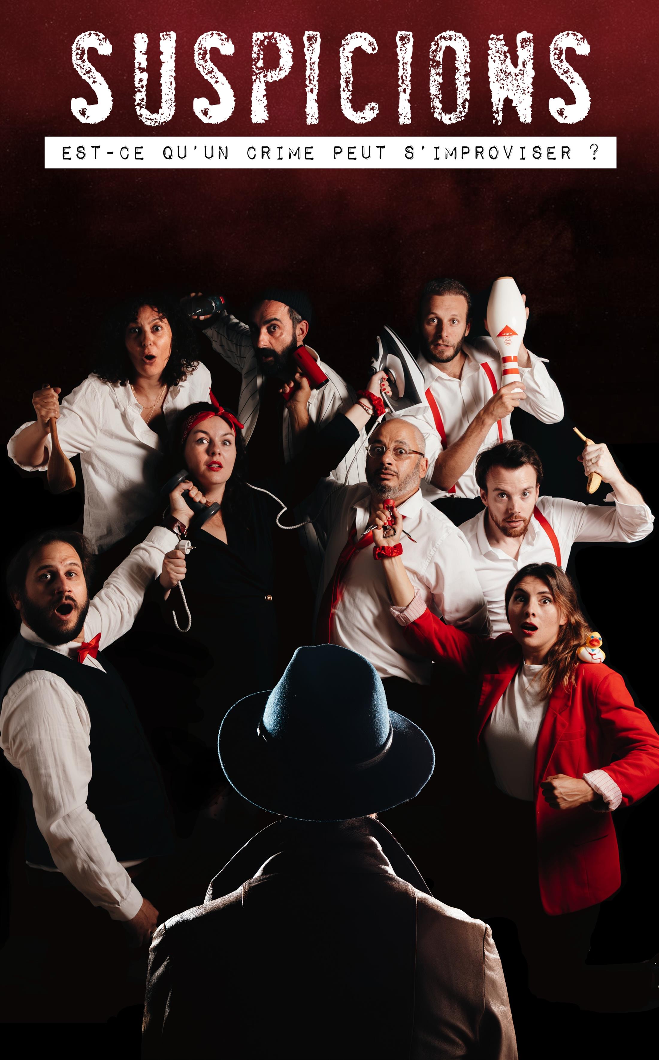 Chaque soir, ça sera à vous de résoudre une enquête pleine de rebondissements, d'histoires rocambolesques et surtout de suspicions… Est-ce qu'un crime peut s'improviser ? À vous d'en juger ! Trois suspects pour une victime, un public inspecteur pour une enquête, découvrez Suspicions !