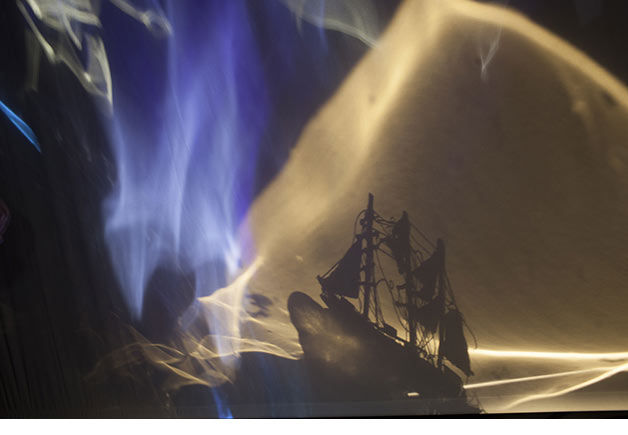 Un bateau qui voyage sur des rails posés sur le plateau, comme un travelling de cinéma, accompagne le comédien dans ses déplacements. Il porte dans sa soute les sources lumineuses qui projettent l’ombre du comédien et de son environnement sur trois écrans consécutifs. Ce sont la plume et l’encre de ce Gulliver d’aujourd’hui, ses outils de travail pour raconter ses aventures et mésaventures.