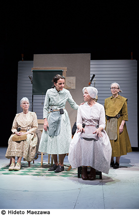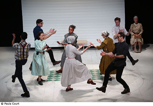 La ferveur de l’engagement, la place des femmes, la quête d’un autre vivre ensemble sont également au cœur de Early Shaker Spirituals : A Record Album Interpretation. Mis en scène par l’actrice fétiche et caméléon du Wooster Group Kate Valk, le spectacle s’appuie sur le disque de chants d’une communauté religieuse américaine, les Shakers. Prônant une esthétique de la simplicité et la joie du travail, ces chants d’une grande pureté sont interprétés et dansés par quatre actrices, accompagnées de quatre jeunes acteurs masculins. C’est une célébration extatique, un hymne à la communauté et au plaisir d’être ensemble, sentiment qui anime le Wooster Group depuis plus de quarante ans.