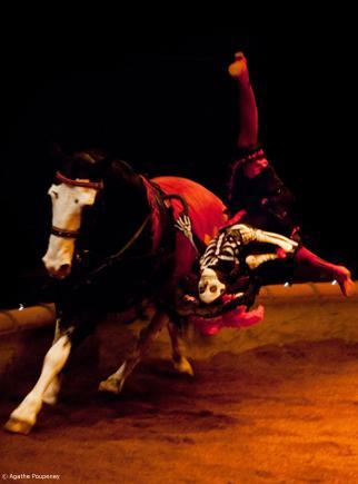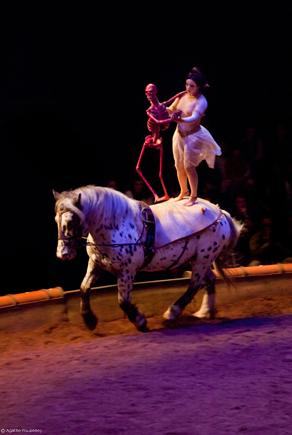 Tous les spectacles de Zingaro évoquent cela : que ce soit la fin de Darshan ou de Loungta (je pense au travail avec les moines tibétains), que ce soit frontal ou allusif. Cette présence de la mort est là, et d’une manière plus criante dans Calacas. Enfin, parler de la mort c’est parler du divin. Peu importe que l’on soit croyant ou pas. Commencer le spectacle à la date du 2 novembre (jour de la Fête des Morts) n’est bien sûr pas innocent. En même temps, montrer le squelette de l’homme (contrairement à Triptyk où l’on voyait des sculptures de chevaux qui pouvaient figurer des squelettes de chevaux), c’est aussi une façon de dire ce qui est profondément enfoui à l’intérieur de soi. Montrer le squelette, c’est montrer le dedans, l’intérieur, ce qui ne se voit pas ; ce qui m’amène à l’idée du visible et de l’invisible.