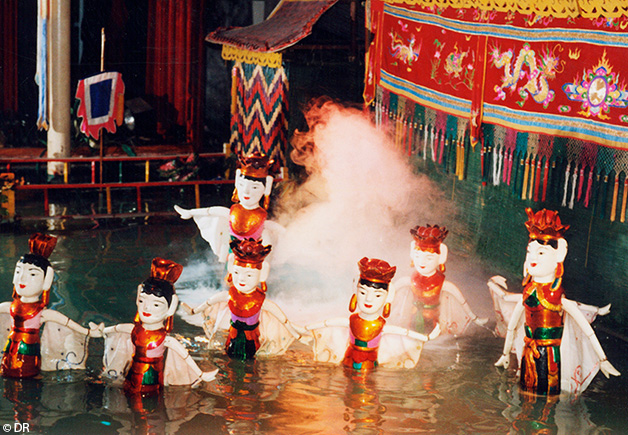 Les marionnettes sur eau du Vietnam (Hanoï) sont les héritières d’une tradition ancestrale : le mua roi nûoc. Reconnu dès 1121, adoubé par le roi pour sa perfection, cet art est né au nord du Vietnam où l’eau prédomine et règle les cycles de la vie des paysans et des pêcheurs. Depuis toujours, les marionnettes sont un spectacle populaire qui met en scène les travaux et les jeux des villageois. Pendant de nombreux siècles, les paysans ont gardé jalousement le secret de la manipulation des poupées, qu’ils ne transmettaient qu’aux membres de leur famille. Par la suite, des troupes professionnelles ont développé cet art dans les théâtres urbains.