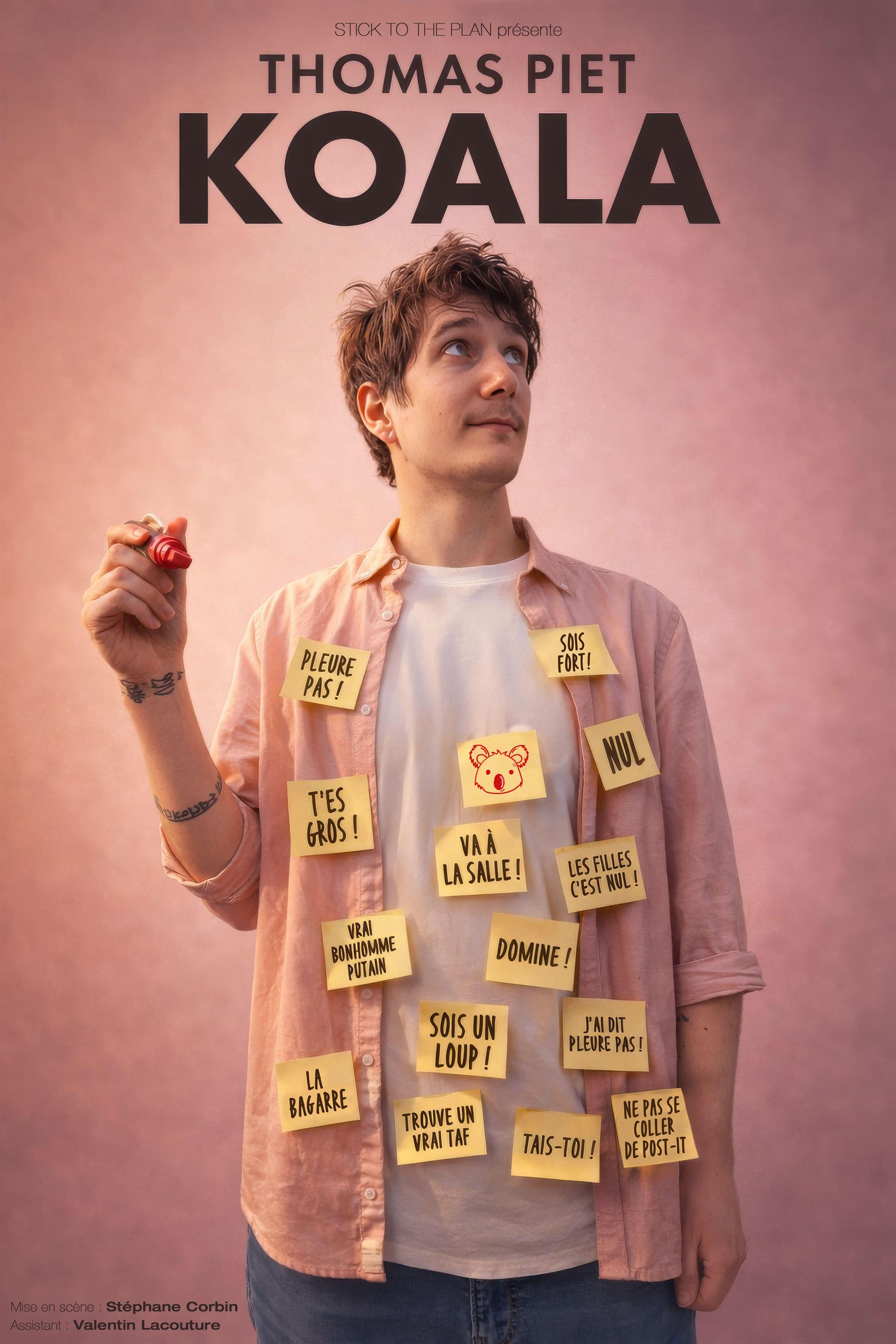 Koala est un seul-en-scène drôle, musical et intime où Thomas démonte tout ce qu'on a mis dans sa tête pour faire de lui un « vrai bonhomme putain ! »