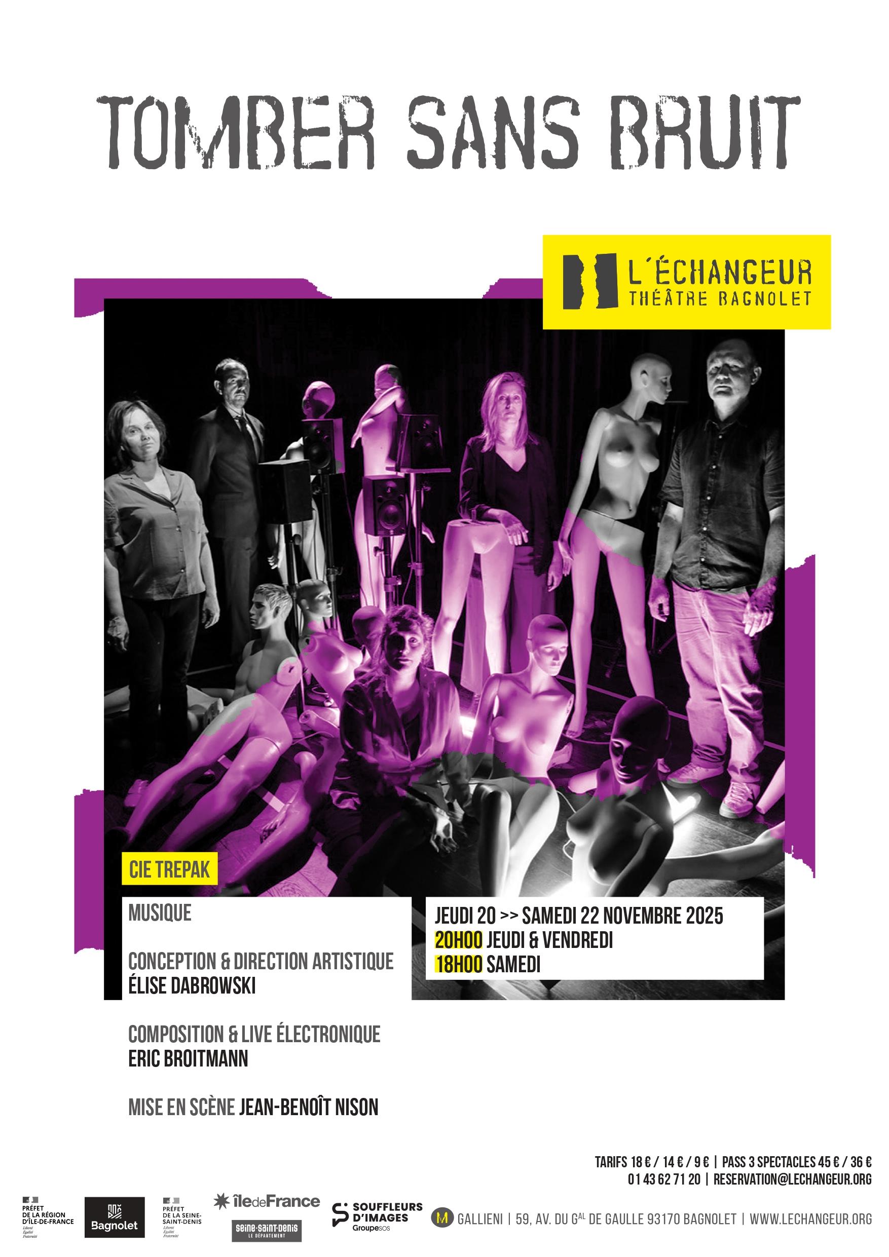 Réalisé à partir d’archives sonores et visuelles, Tomber Sans Bruit s’inspire librement du drame industriel et social d’un grand groupe français, leader de l’habillement : Vivarte. Sur scène, salarié·e·s et dirigeant·e·s dialoguent avec un chœur de haut-parleurs et rejouent les échos d’une chute annoncée, mêlant leurs voix à la musique électronique et au trombone. À partir de 14 ans