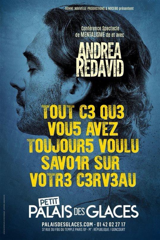 Dans une ambiance détendue et intimiste, participez à des expériences étonnantes dans une Conférence-Spectacle interactive d'Andrea Redavid, qui mêle apprentissage et découvertes en vous dévoilant de façon ludique les pouvoirs extraordinaires de nos outils perceptifs et cognitifs… et en vous faisant ainsi parcourir un voyage incroyable à l’intérieur de votre esprit.