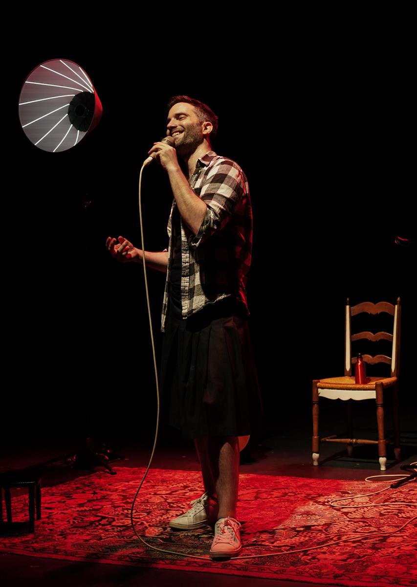 Il en a sous la jupe ce jeune et talentueux Artiste, quelle énergie, une bien jolie voix, un seul en scène participatif (ce n'est pas ce qui m'enchante le plus, mais bon, c'est un concept qui plait au public !). Revenons à l'excellent Artiste, très proche du public, se jetant dans la foule... mais capable de faire chanter les touches d'un piano sur mesure. Original donc et qui bouscule les codes avec malice au point de nous entraîner, nous réunir, nous faire passer un vrai moment de détente.