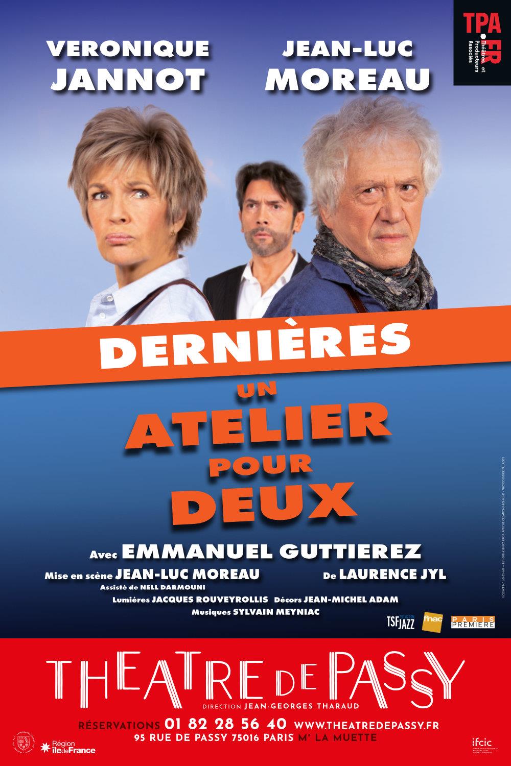 Cet « Atelier pour deux » est avant tout le lieu de la créativité, de la complicité artistique et du partage que vivent Sabine (Véronique Jannot) et Bertrand (Jean-Luc Moreau). Jusqu'au jour où l'amour frappe à la porte et que tout bascule. La pièce de Laurence Jyl nous propose avec humour des réponses inattendues sur le couple, l'amour et les urgences du temps qui passe. Cette comédie est un souffle de bonheur et de drôlerie.