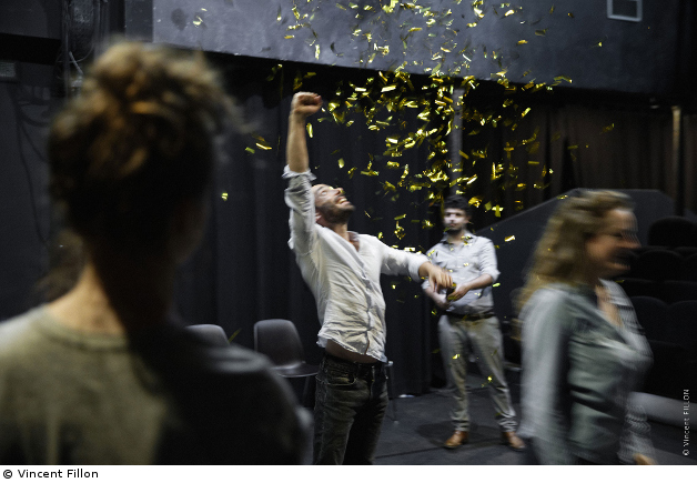 Cet état d’égalité avec les comédien.ne.s (pas d’illusion théâtrale, tous les accessoires à vue etc..) permettra au spectateur de remettre notre actualité et notre vie politique à sa juste place : une histoire qui ne demande qu’à être écrite et qui attend que nous nous en saisissions.