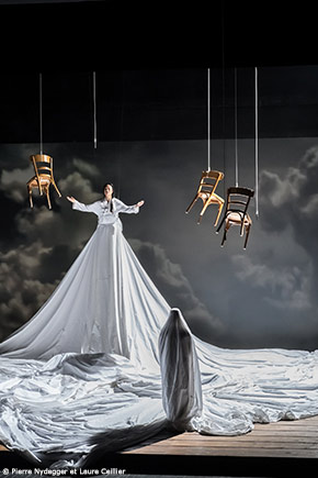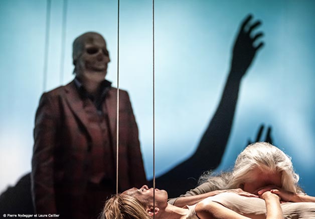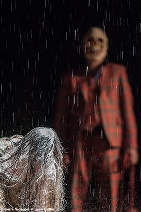 La lumière bien sûr mais aussi l’image vidéo. Le son est, comme toujours dans notre travail extrêmement présent, il permet de créer un état particulier pour les acteurs et les spectateurs, proche de la transe. Nous utilisons aussi un matériau très simple, le drap, qui évoque le sommeil, mais aussi le linceul et le fantôme. Et nous travaillons sur une série de masques très réalistes qui provoquent un trouble dans la perception des identités des acteurs.