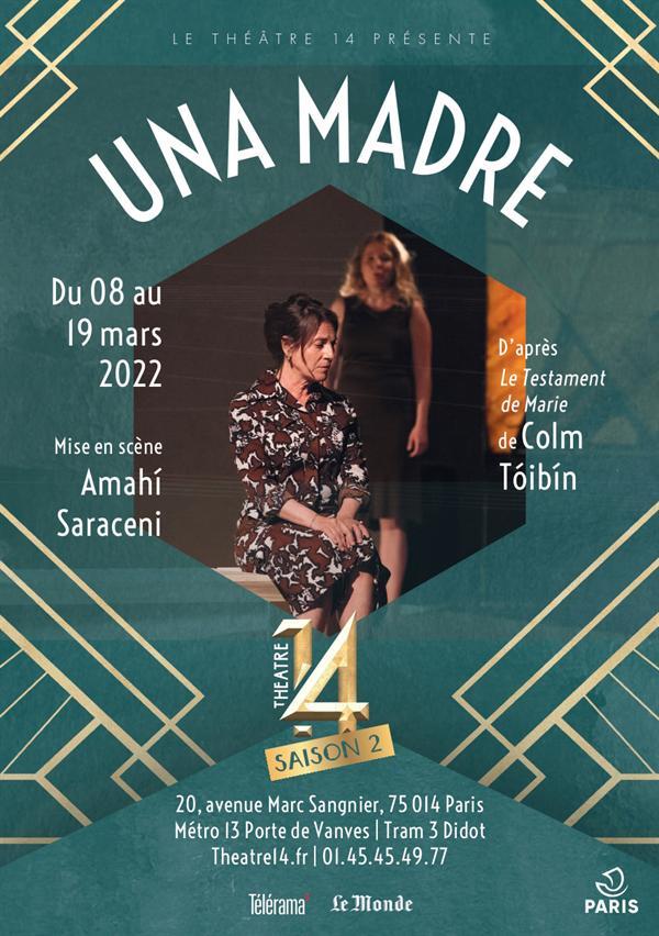 Una Madre est une installation, un concert, une danse, une pièce de théâtre. Chaque art se côtoie, s’affirme, s’isole et met l’autre en lumière. Une femme que nous avons toujours vue muette se met à parler et nous raconte ce qu’elle a réellement vécu, l’éloignement et la mort de son fils. Le texte de Colm Tóibín, Le Testament de Marie, est le fil d’Ariane qui parcourt cette création.