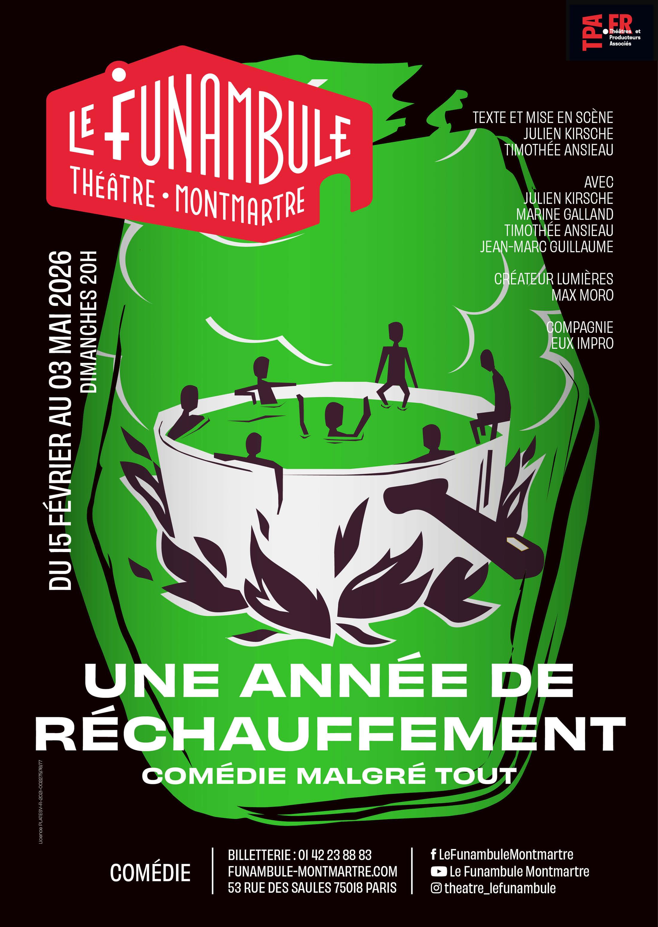 Une année de réchauffement est une pièce drôle, pédagogique, dramatique et fantaisiste où l'on voit Jeanne et Fred se débattre comme nous tous pendant que le compteur carbone tourne et que la planète et les esprits, se réchauffent…