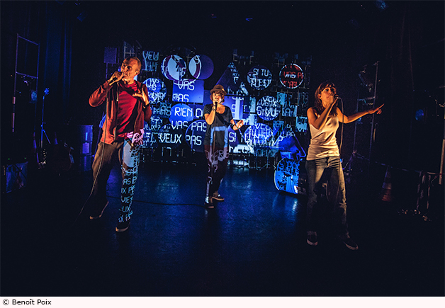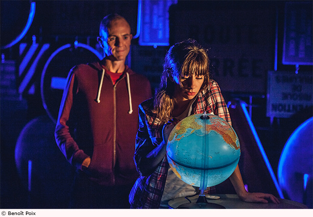 Le plateau est en chantier. Bidons industriels, plots, rubans rouges et blancs, panneaux signalétiques. Marie Filippi et Henri Botte, les deux comédiens, jouent avec tout ce matériau, s’en emparent et projettent dessus des images vidéo diffusées du lointain. Lexie T, musicienne beat boxeuse, crée un espace sonore, entre ici et là-bas, et amplifie l’énergie du plateau. Tous ensemble, ils interpellent le réel pour rejouer l’histoire et voir comment chacun trouve sa place, en-dehors des conventions, porté par son désir et le souffle de son énergie.