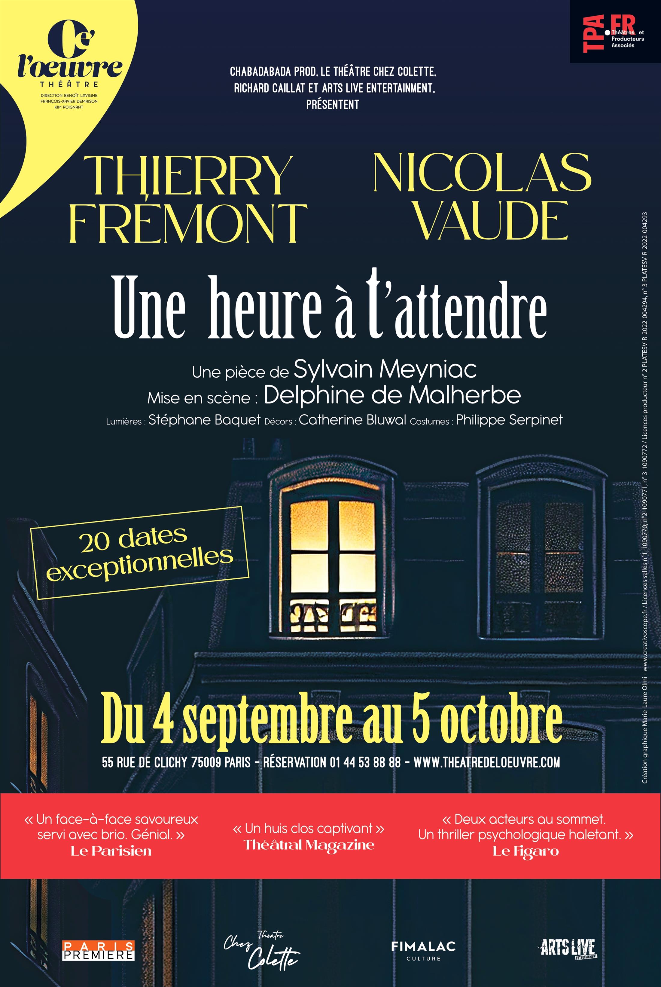 Hier est un autre jour, titrait l’auteur dramatique Sylvain Meyniac dans sa très belle pièce nommée aux Molières. Son nouvel opus Une heure t'attendre se joue aussi du temps comme du cœur des hommes dans un univers aux antipodes. Sur un texte de haute volée, il entre ici dans la cour des grands par la porte de l’intime et du littéraire. J’ai immédiatement eu envie de mettre en scène ce face à face tendre et cruel qui place un écrivain face à avocat dans un huis clos aussi troublant que palpitant. Sur des mots de cœur et de chair, nos héros tutoient l’âme humaine au plus près, et j’entends offrir au spectateur les loupes et les miroirs qui vont leur donner les clés de nos secrets les mieux gardés.