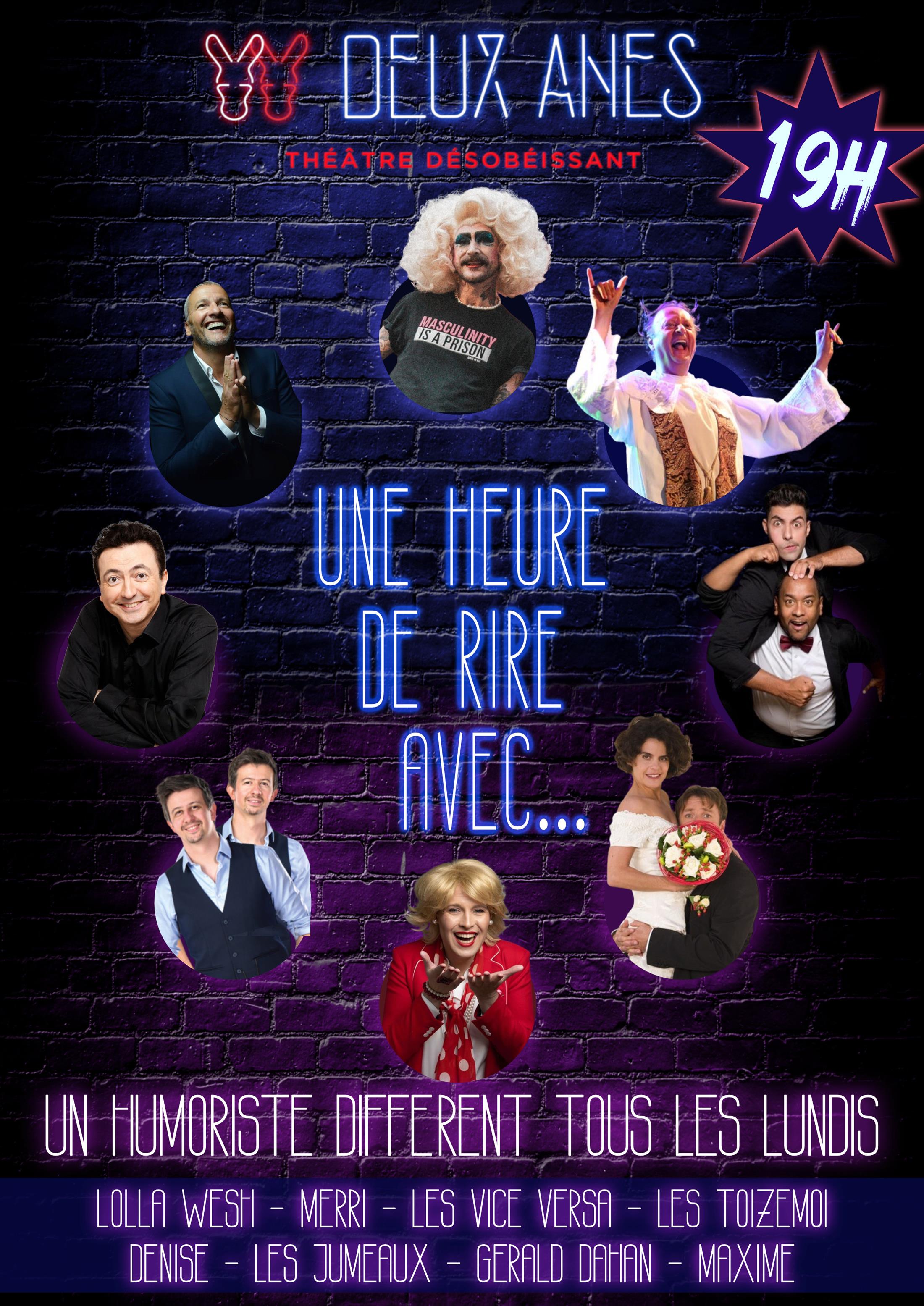 Chaque lundi, un humoriste, ou un duo d'humoristes investit la scène du Théâtre des Deux Ânes pour y jouer son spectacle !