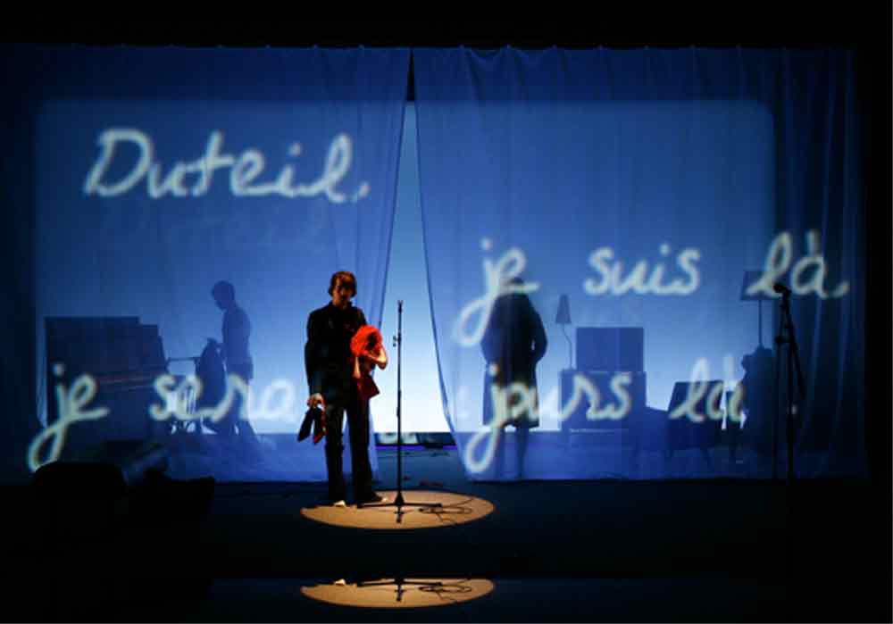 Des musiques du voyage de 82 — the Clash, Joy Division, Bauhaus… L’univers sonore de Jean, le fils, musicien de rock en tournée allemande. Des gares, des trains, des foules. Le silence d’après-guerre et ses stridences parfois. Des images projetées, filmées en France et en Allemagne : les étapes du voyage de 1982, re-foulées en 2008. Filmer les traces de l’absence : celles du passé recouvert, celles de visages qu’on ne verra jamais. Des paysages, des lieux vides, passages furtifs, mouvements, fragments de corps aperçus.