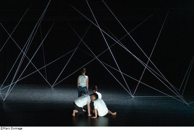 Ni narrative, ni abstraite, la chorégraphie écrit une partition musicale faisant vibrer l’espace entier, pour culminer en transe festive sous une lumière noire qui irradie le blanc des corps et des cordes: cordes qui structurent l’espace mental et vont s’assouplir sous l’effet de la danse, cordes du quatuor musical dont les danseurs sont les interprètes et les maîtres, et finalement leurs propres cordes vocales qui déclenchent les pistes musicales en dansant. Une virée nocturne lunaire et envoûtante.