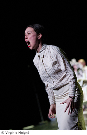 Martin Legros, metteur en scène du spectacle au sein du collectif, s’intéresse à la manière dont Mayenburg se saisit des formes de violence ordinaire contemporaines. Pour cette adaptation, l’acteur, musicien et cofondateur du collectif caennais, a choisi d’entretenir un rapport très frontal avec les spectateurs, comme si l’histoire se fabriquait en direct devant lui.