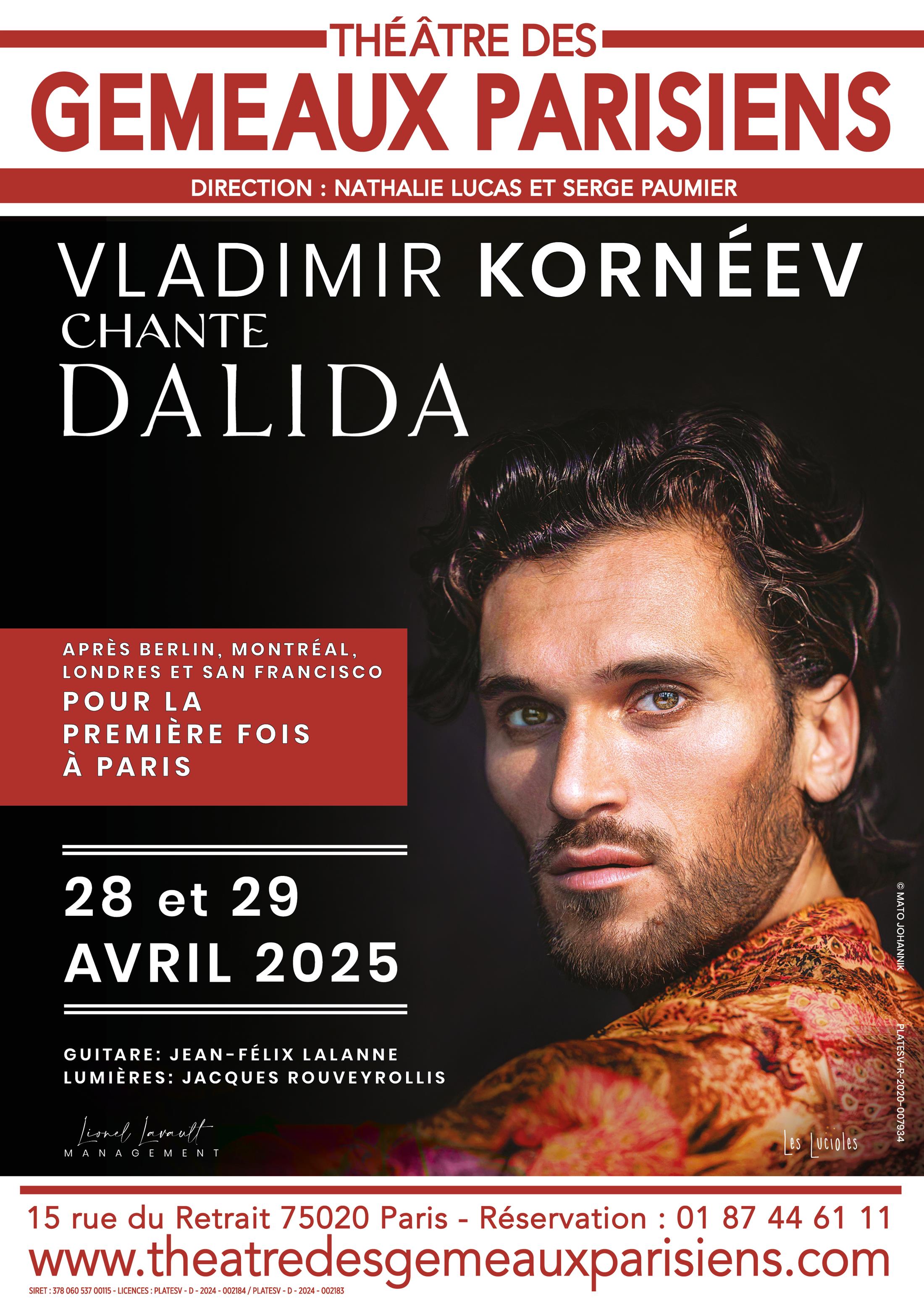 Chanteur et acteur d’origine géorgienne qui a déjà séduit le public de Berlin à San Francisco en passant par Montréal et Bruxelles avec ses interprétations de grandes chansons françaises (Aznavour, Brel, Piaf ainsi qu’avec le répertoire de Kurt Weill), Vladimir Kornéev rend maintenant hommage à l’unique Dalida.