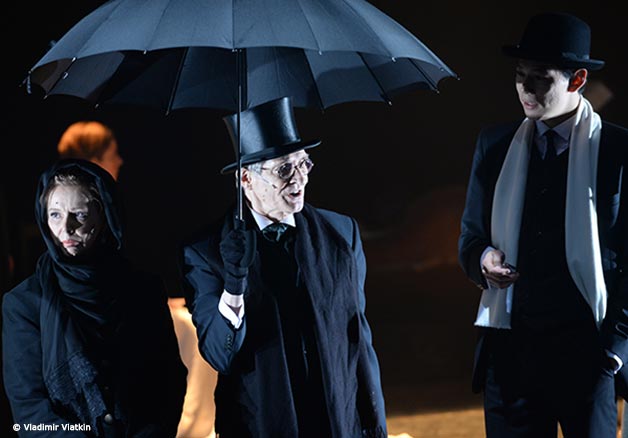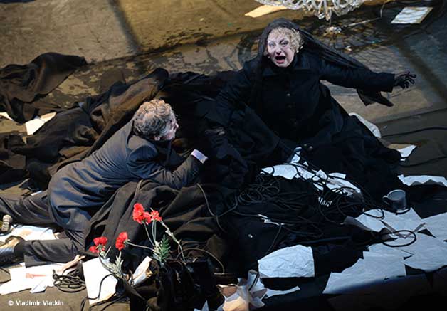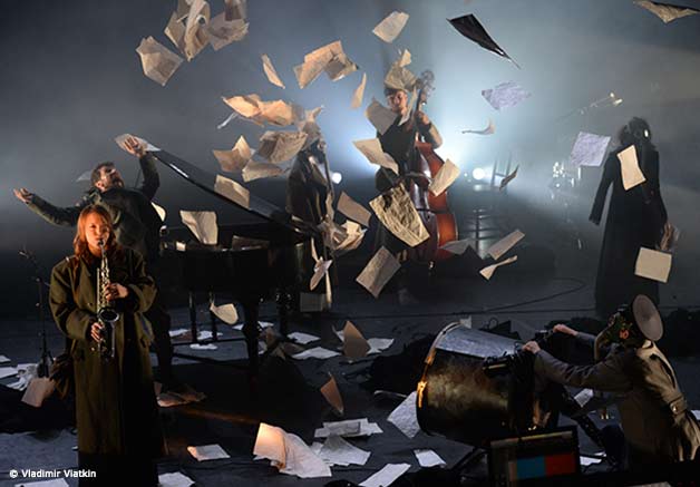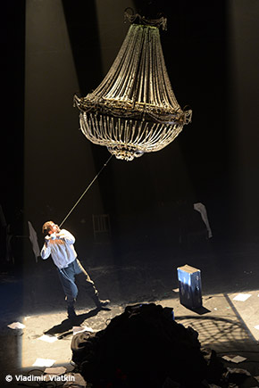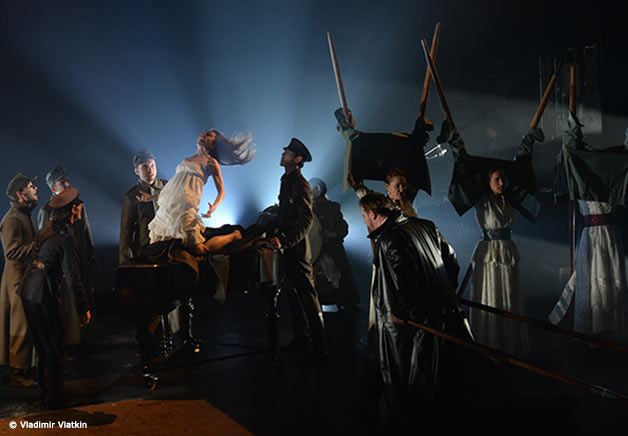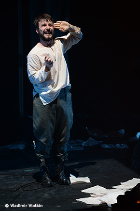 Chez Vladimir Pankov qui a présenté au Théâtre des Abbesses en 2010 une Noce fort éloignée de nos habitudes tchékhoviennes, chaque interprète est un instrument de musique mobile, mêlé aux vrais instruments, aux bruits, aux images, en un mouvement commun qui compose une forme d’opéra. Le texte de Voïna, d’ailleurs, est qualifié de « livret ».