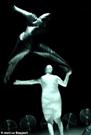 Au centre d’une arène de ventilateurs, une silhouette informe scotche au sol des bouts de sacs plastique : une marionnette en devenir, qui, sous l’effet des courants d’air, s’envolera dans d’époustouflantes arabesques. Non identifiable sous un étouffant costume prêt à imploser, Phia Ménard vide ses poches de nouveaux sachets de plastique, et regarde les poupées de polymère danser dans l’air. Peu à peu, ce sont des mues que l’artiste fait valser, se dépouillant de peaux subsidiaires (bâche noire, vinyle blanc, élastomère couleur chair), jusqu’à sortir ses tripes, pour mieux se mettre à nu.