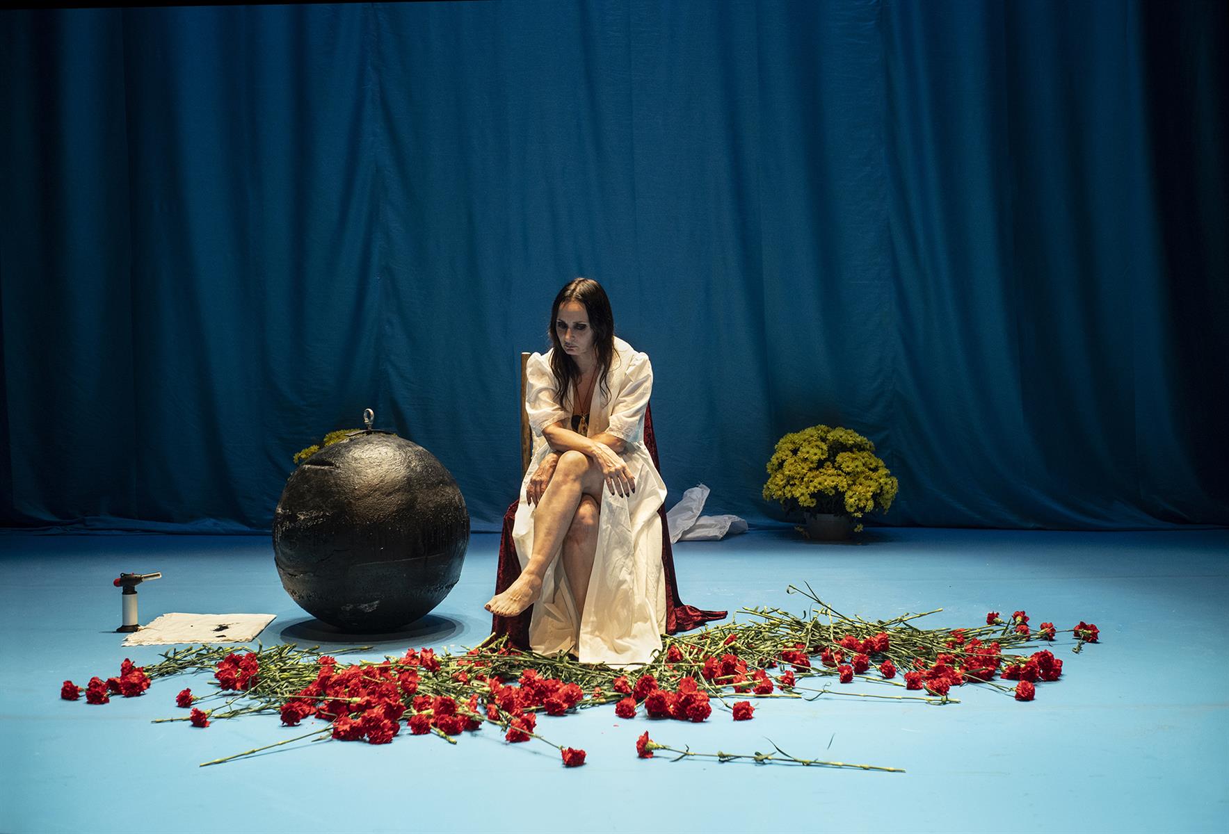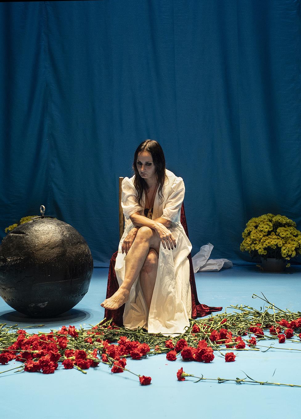 Au centre de la scène, sa brûlante poésie se mêle aux peintures sanglantes de Hermann Nitsch, résonne étrangement avec les chansons de Jacques Brel ou de Joe Dassin et s’attise, à nouveau, au souvenir de la littérature de Karen Blixen.