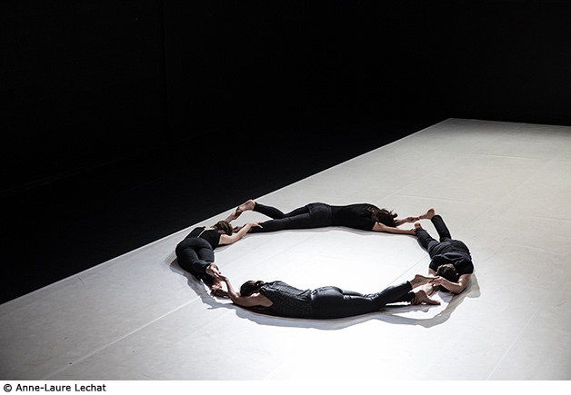 Elle a choisi pour cela de revisiter la figure de la ronde, cette forme de danse immémoriale qu’on retrouve dans de très nombreuses cultures, l’ambition étant ici de transformer la structure commune, l’architecture elle-même, autant que chaque corps. Dans le silence, qui crée une densité particulière et un espace tactile, les danseurs évoluent selon un principe de réciprocité : chacun est à la fois soutien et soutenu, réceptif et producteur. Quelque chose se déplace entre les corps, même lorsqu’ils sont immobiles ; un espace de résonance s’ouvre. La dimension rituelle de la ronde est ainsi activée simplement par l’attention, la patience et l’engagement réclamés aux danseurs comme aux spectateurs.