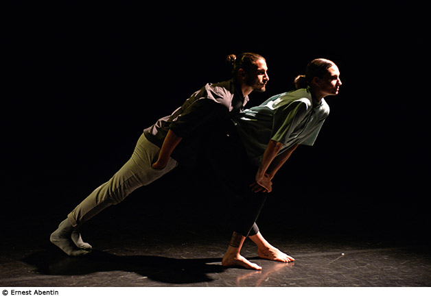 Dans Iskio en revanche, la rencontre entre les deux danseurs passe par des appuis ; ce n’est pas le souffle invisible, comme dans Loom, mais la force du contact d’un corps à l’autre qui actionne le mouvement.