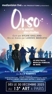 Orso et le Secret des Étoiles est un conte musical familial écrit par Sylvie Gaillard et mis en scène par Ludovic Marcato (Mozart l’opéra-rock, Mugler Follies…). Ce spectacle haut en couleur traite, avec humour et énergie, de la peur de la nuit, du temps et de la confiance en soi.