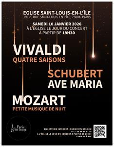 Concert de l'Orchestre Paris Virtuosi sur Les Quatre Saisons de Vivaldi et Petite musique de nuit, de Mozart et l'Ave Maria de Schubert.
